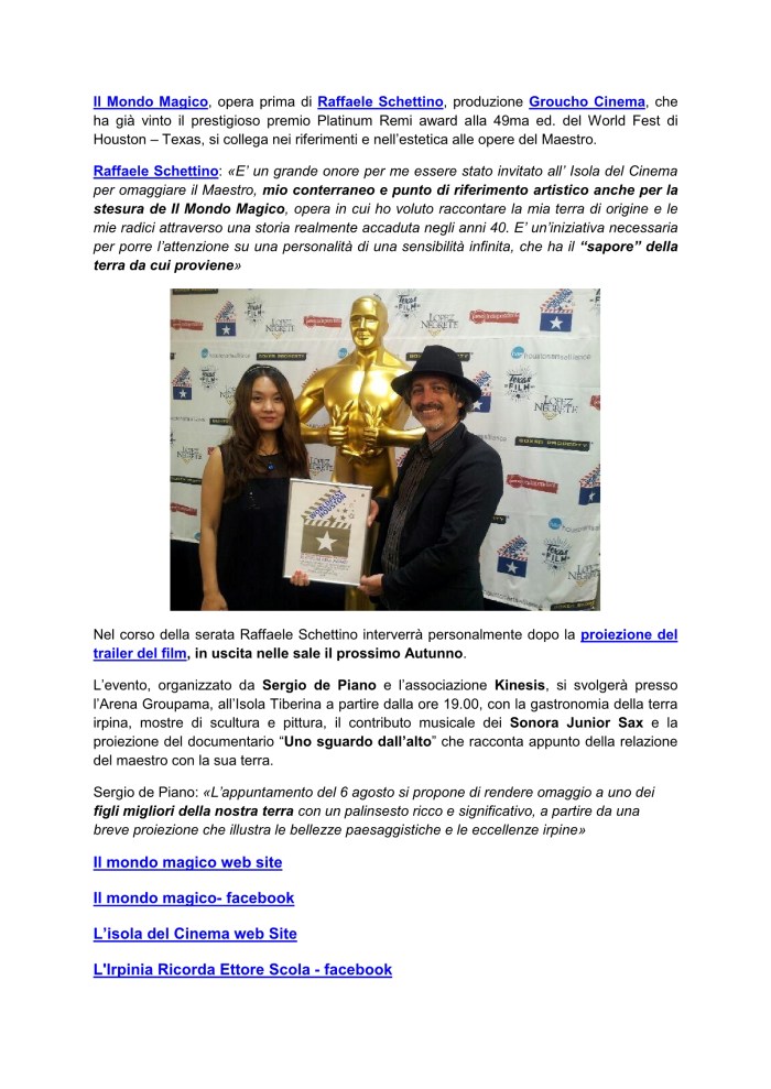 Saranno presenti a Ferrara il regista Raffaele Schettino, l’attrice Mara Calcagni, lo sceneggiatore Daniele Trovato e la Lega di Cultura di Piadena. Il film uscirà nelle sale italiane nell’autunno 2016.